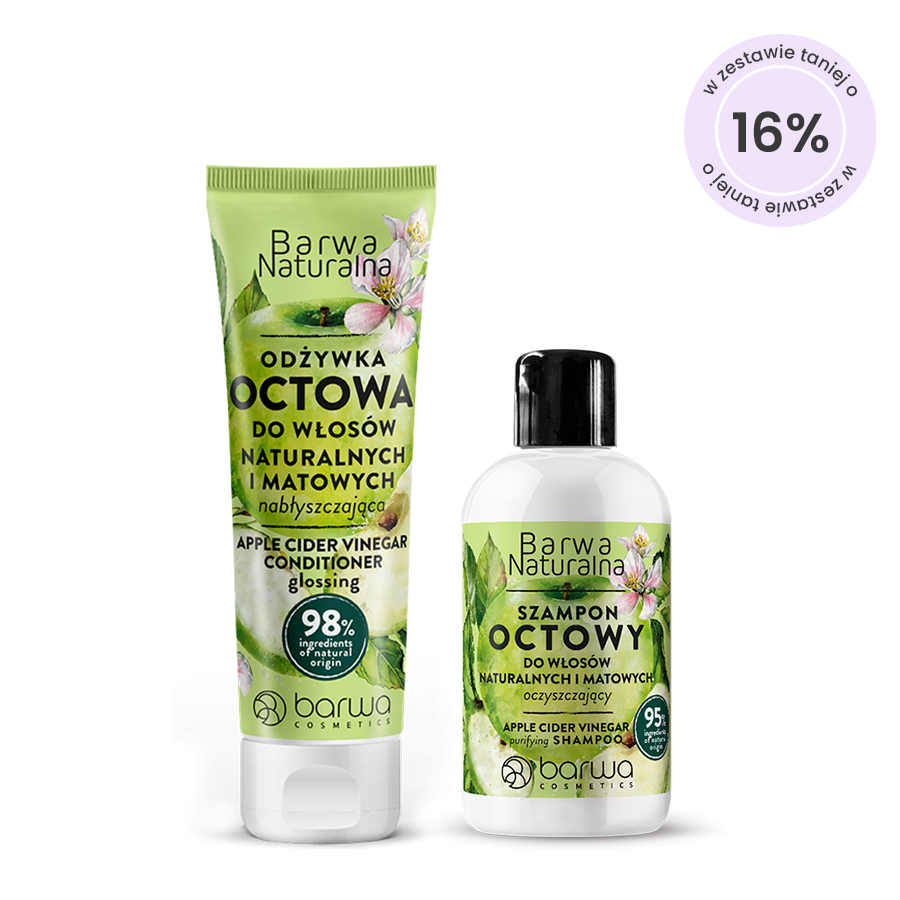 Mini Odżywka Octowa i mini Szampon Octowy Barwa Naturalna doskonale nabłyszczają pasma włosów i ułatwiają ich rozczesywanie. Niezastąpiony podczas podróży!